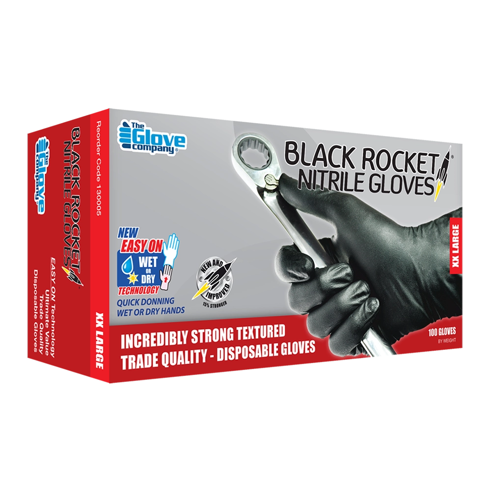 Black Rocket Nitrile Disposable Gloves – Designed specifically for the Automotive Industry Performance and value working together. The toughest, cost effective, trade based black nitrile disposable gloves you will experience.