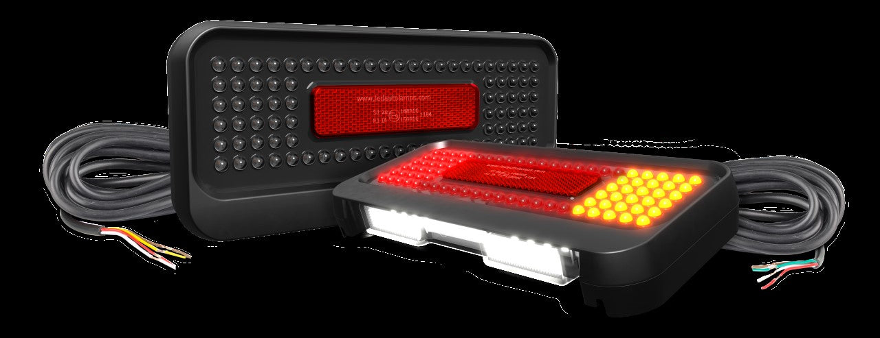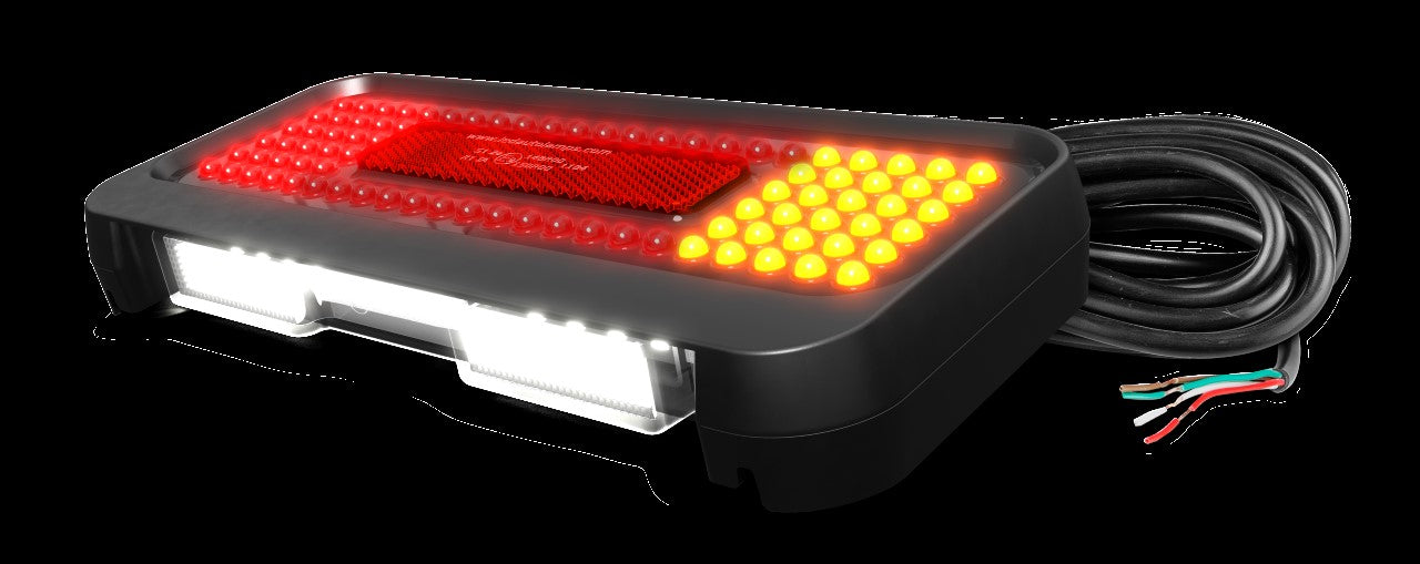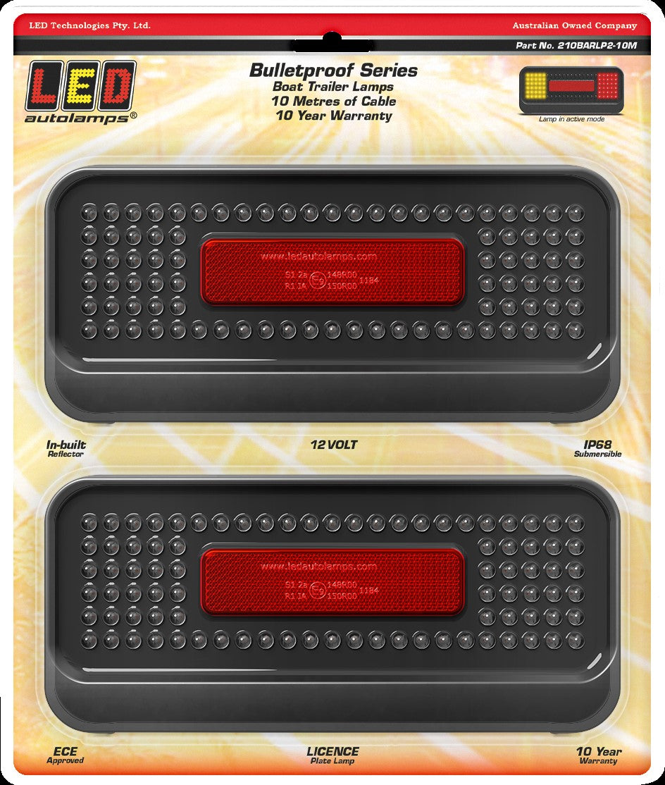 Fully Submersible Boat Trailer Lamp Kit, Includes 1 x RHS Stop/Tail/Indicator/Reflector Lamp with Licence Plate Lamp and 1 x LHS Stop/Tail/Indicator with Reflector. 12 Volt Only, 10 Metres each side of cable, Twin Blister pack. IP68 Submersible, 10 Year Warranty, 210mm x 96mm x 28mm, ECE Approved.
