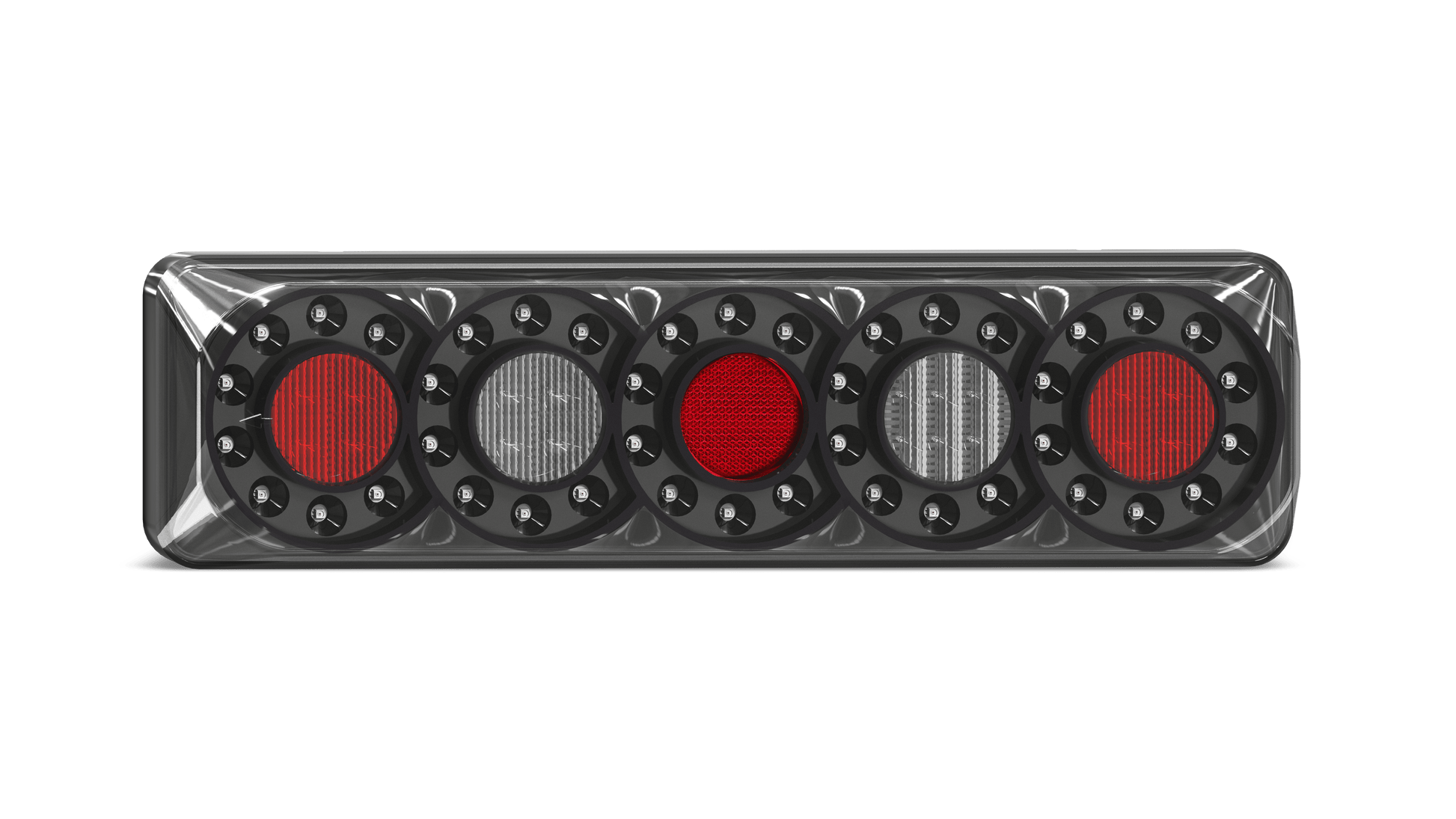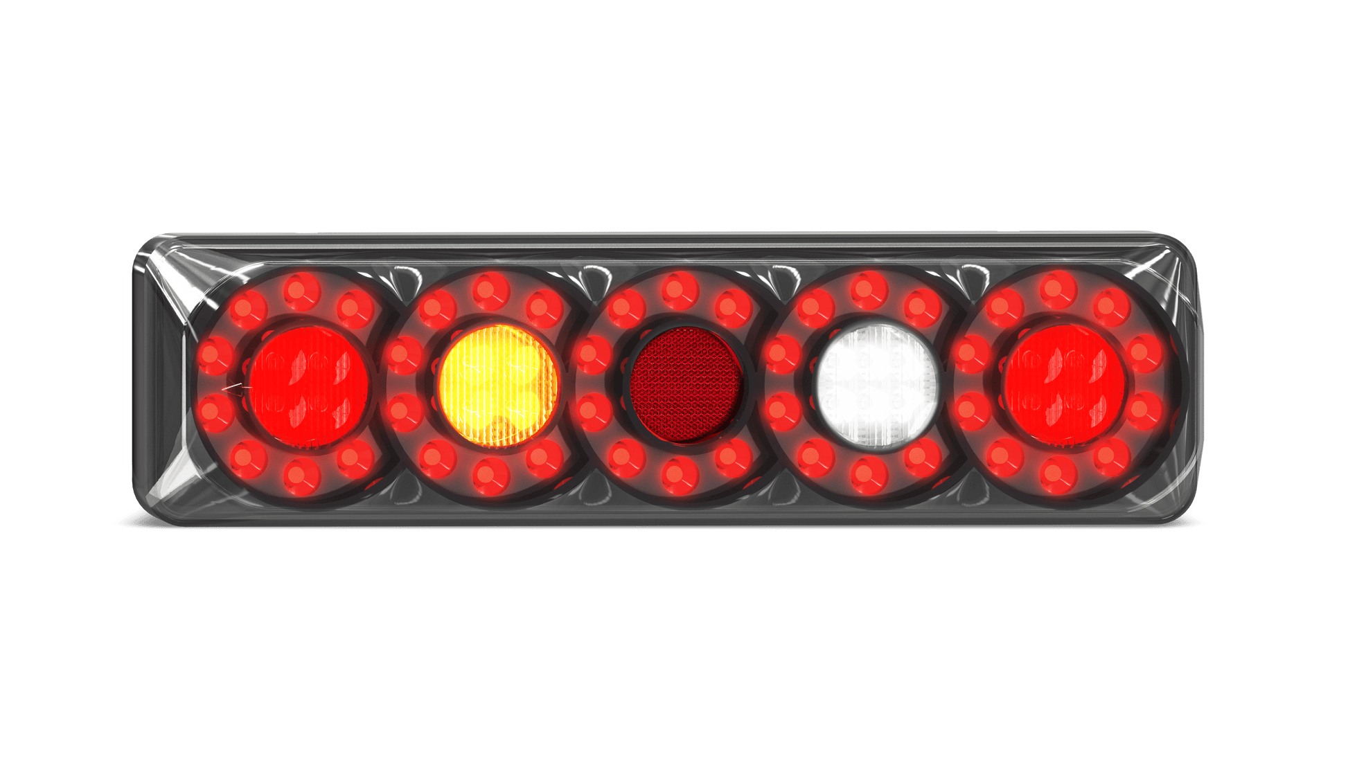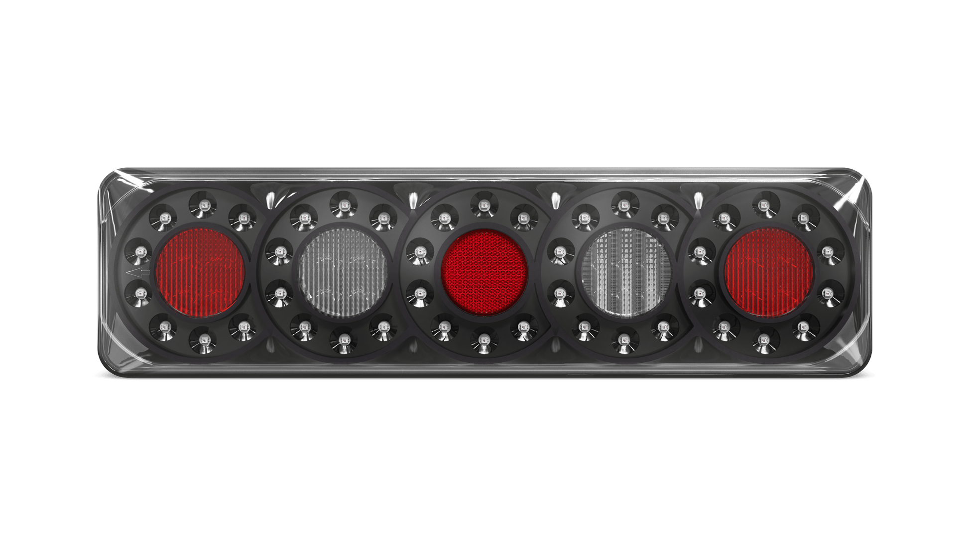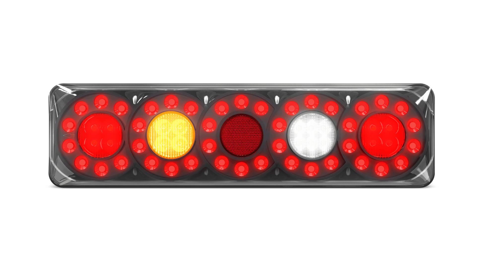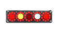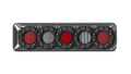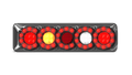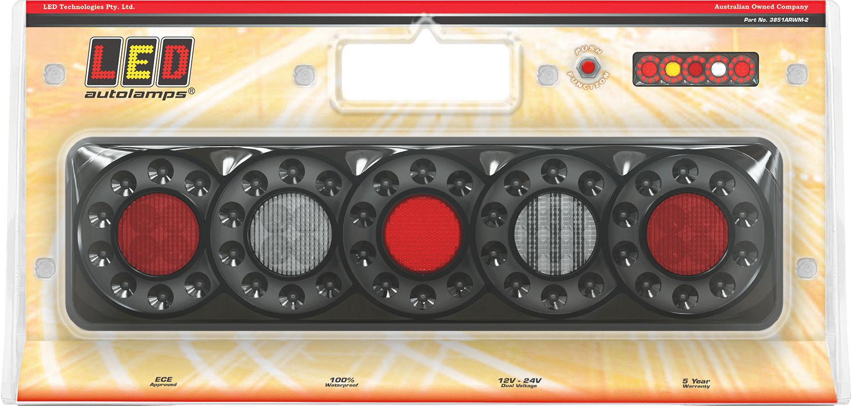 Rear Combination lamp with 5 Circle Lens pattern, Stop/tail, Indicator and Reverse lamp with Inbuilt reflector, Twin Blister Pack with LHS & RHS +Push function button, 12-24V Multivolt, ECE Australian Road Approved, IP67 Rated for Water and Dust Proof, Surface Mount with base and clip in lamp, Overall size 387 x 105 x 30.5mm, 5 Year Warranty